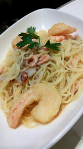 桜エビ、ゆで海老、えび天の、海老が三種類パスタだった